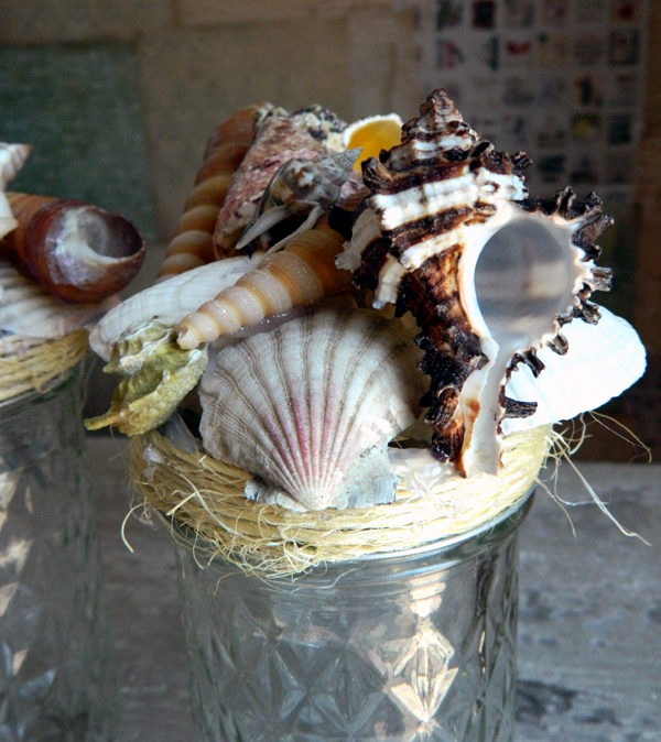 What to do: I started by wrapping the lids with twine and securing in place with dabs of hot glue here and there. I thinking I might also wrap some twine around the center of the glass, but for now just around the lid. Then you want to apply a base layer of plain shells.